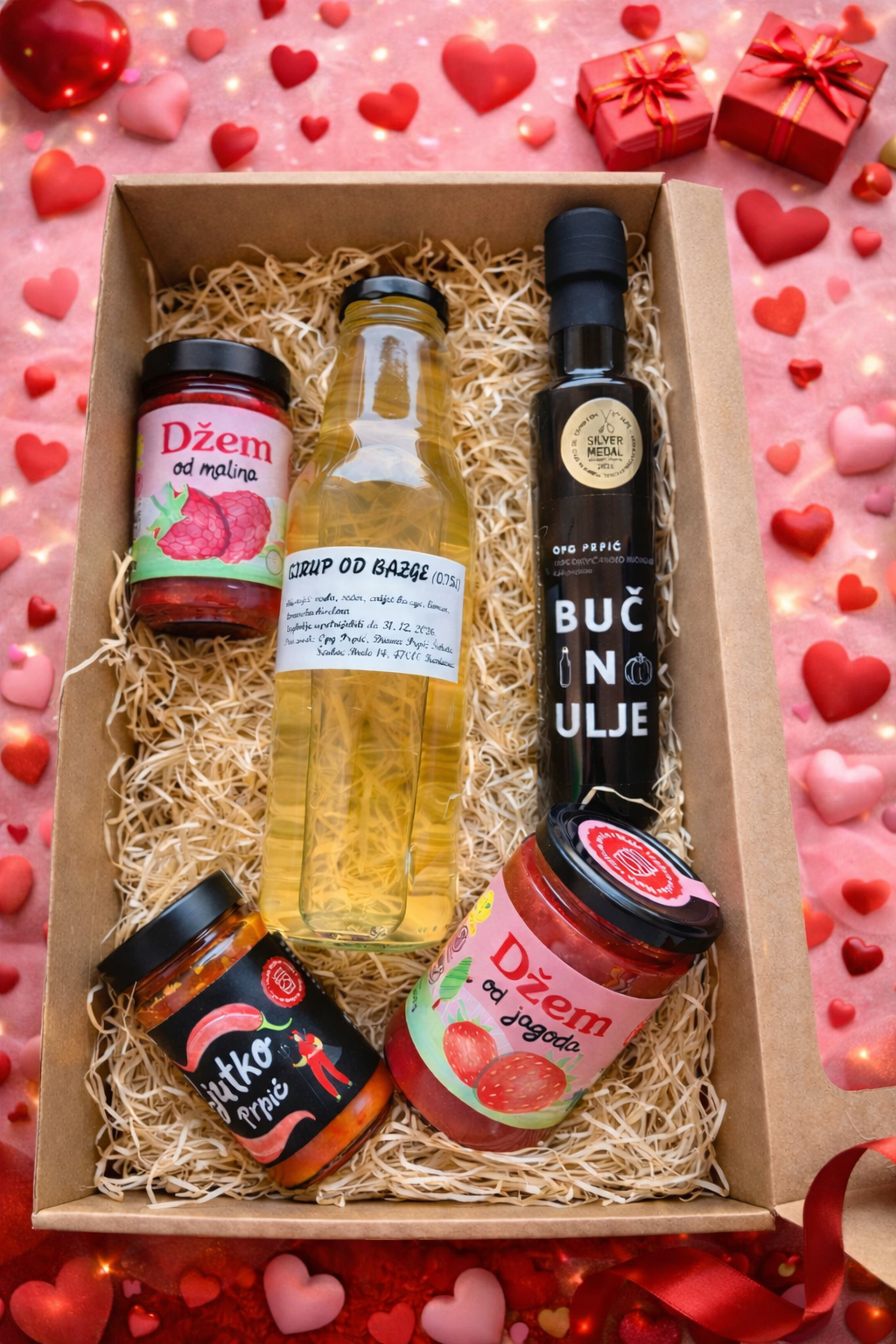 Poklon koji će razveseliti baš svaku ženu. Sadrži sirup od bazge za osvježenje, bučino ulje za “baš onaj okus”, džem od jagoda, džem od malina i Ljutko Prpić – ljuti namaz od paprike – jer baš svaka žena u isto vrijeme može biti i pomalo slatka i pomalo ljuta.